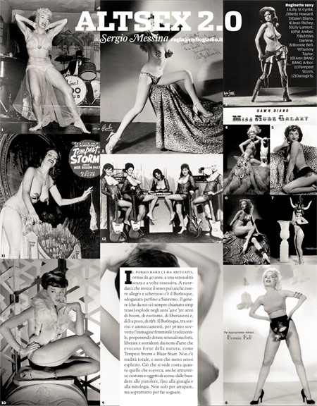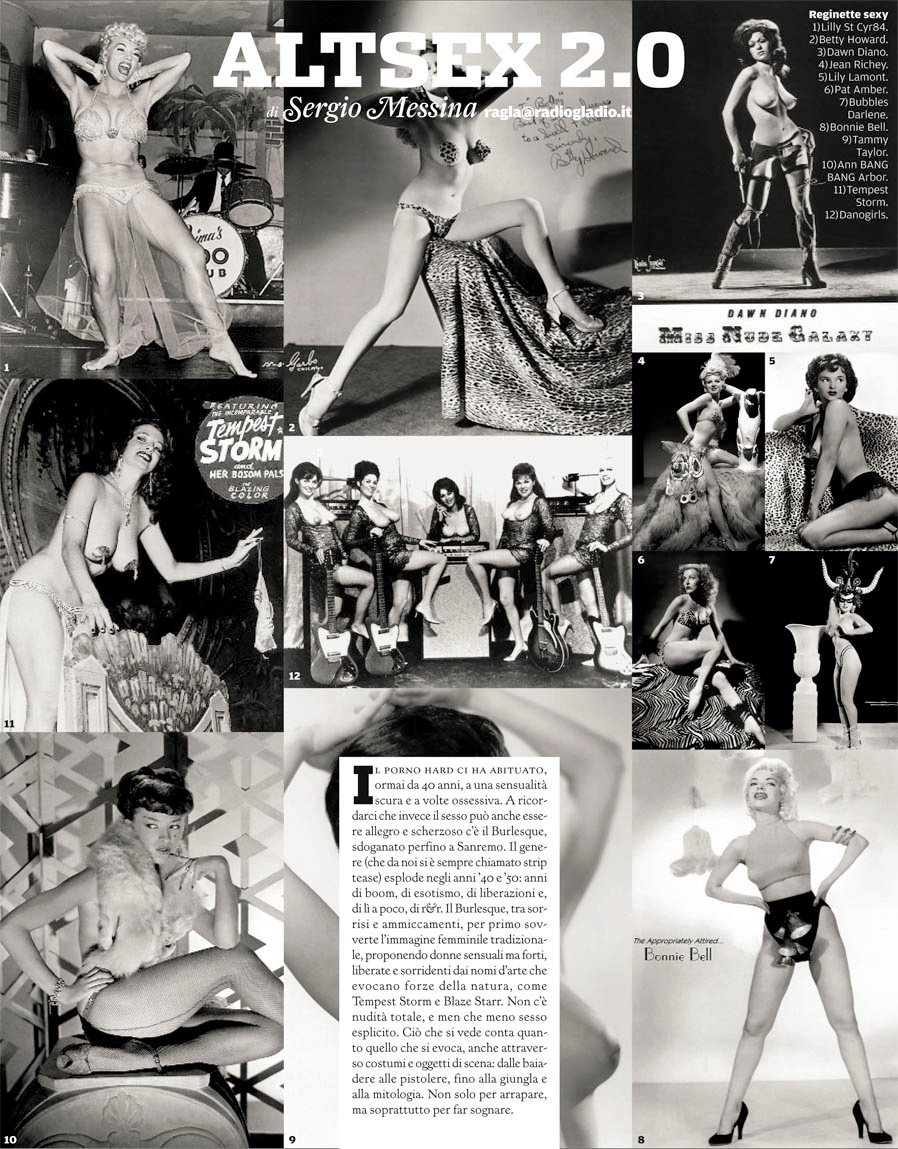 Il porno hard ci ha abituato, ormai da quarant’anni, a una sensualità scura e a volte ossessiva. A ricordarci che invece il sesso può anche essere allegro e scherzoso c’è il Burlesque, recentemente sdoganato perfino a Sanremo. Il genere (che da noi si è sempre chiamato Strip Tease) esplode negli anni ’40 e ’50: anni di boom, di esotismo, di liberazioni e, di li a poco, di R’n’r. Il Burlesque, tra sorrisi e ammiccamenti, per primo sovverte l’immagine femminile tradizionale, proponendo donne sensuali ma forti, liberate e sorridenti dai nomi d’arte che evocano forze della natura, come Tempest Storm e Blaze Starr. Qui non c’è nudità totale, e men che meno sesso esplicito. Ciò che si vede conta quanto quello che si evoca, anche attraverso costumi e oggetti di scena: dalle baiadere alle pistolere, fino alla giungla e perfino alla mitologia. Non solo per arrapare, ma soprattutto per far sognare.