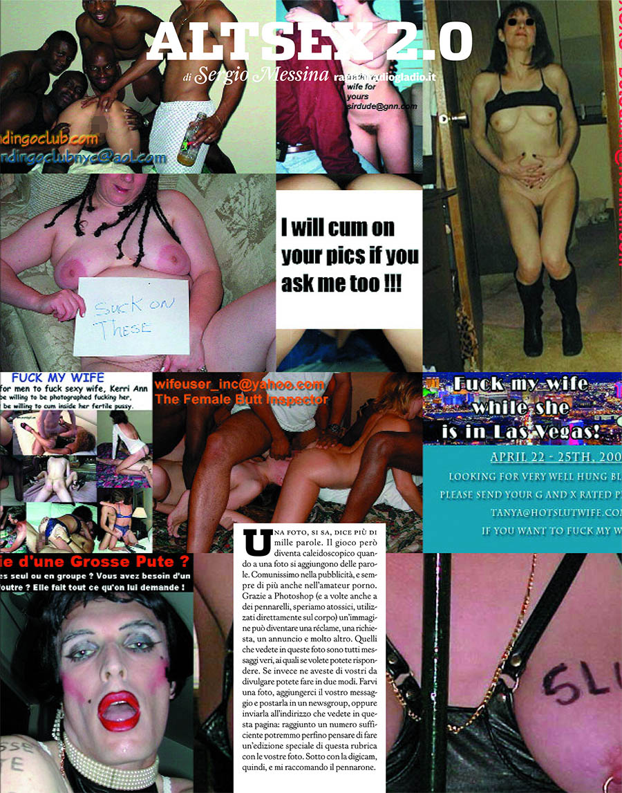 Una foto, si sa, dice più di mille parole. Il gioco però diventa caleidoscopico quando a una foto si aggiungono delle parole. Comunissimo nella pubblicità, e sempre di più anche nell’amateur porno. Grazie a Photoshop (e a volte anche a dei pennarelli, speriamo atossici, utilizzati direttamente sul corpo) un’immagine può diventare una réclame, una richiesta, un annuncio e molto altro. Quelli che vedere in queste foto sono tutti messaggi veri, ai quali se volete potete rispondere. Oh, naturalmente se aveste dei messaggi da inviare con questo metodo potete fare in due modi. Farvi una foto, aggiungerci il vostro messaggio e postarla in un newsgroup, oppure inviarla all’indirizzo che vedete in questa pagina: raggiunto un numero sufficiente potremmo perfino pensare di farne un numero speciale di questa rubrica con le vostre foto. Sotto con la digicam, quindi, e mi raccomando il pennarone.